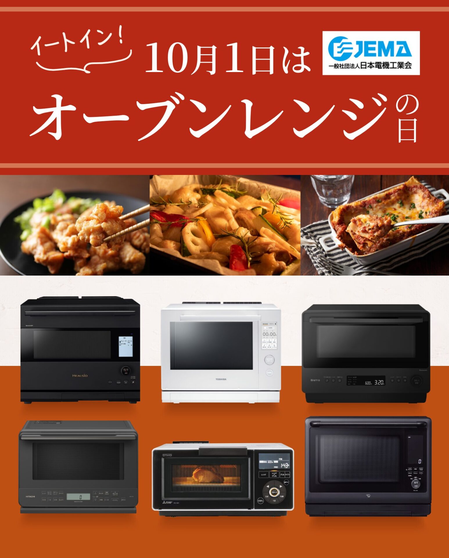 日本の内食文化を豊かにする事を願い、オーブンレンジが活躍する味覚の秋に、内食という意味の“Eat in (イートイン→101)”の語呂合わせで、10月1日を「オーブンレンジの日」と定めました。